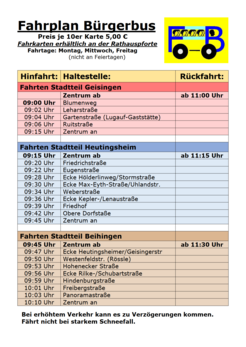 Um den Fahrbetrieb reibungsloser zu gestalten, werden die Fahrkarten nicht mehr wie früher im Bus, sondern nur noch an der Rathauspforte verkauft. Eine Fahrt kostet 50 Cent. Die Karten sind als 10er Paket für 5 Euro im Rathaus an der Pforte zu den üblichen Rathausöffnungszeiten erhältlich.